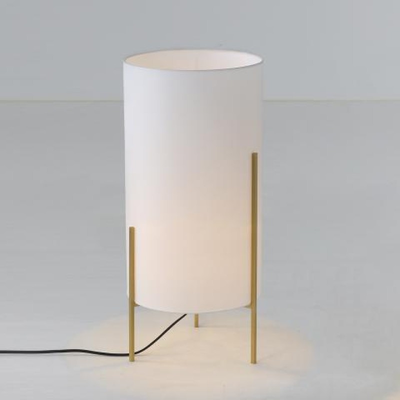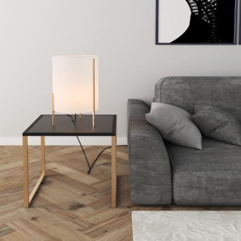 La lámpara de sobremesa Naos cuenta con una pantalla cilíndrica de tela permite aportar una acogedora iluminación de ambiente en la estancia.