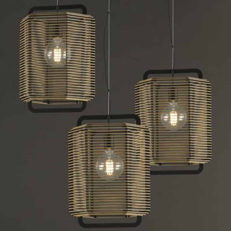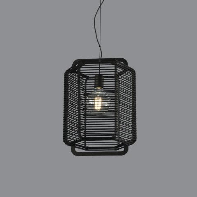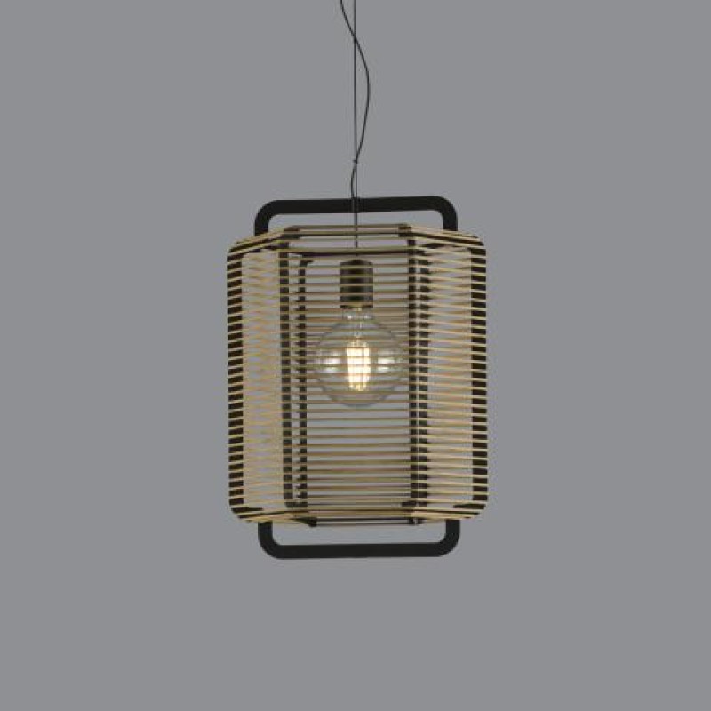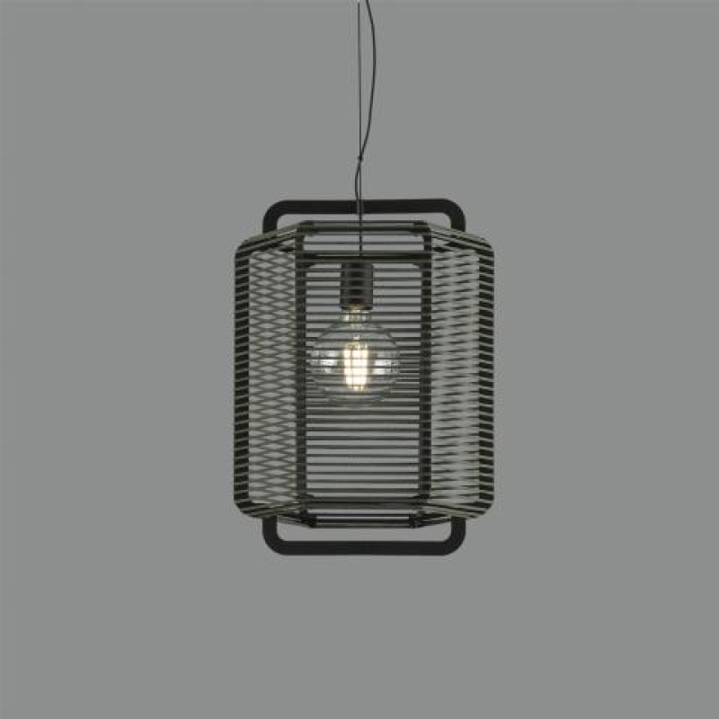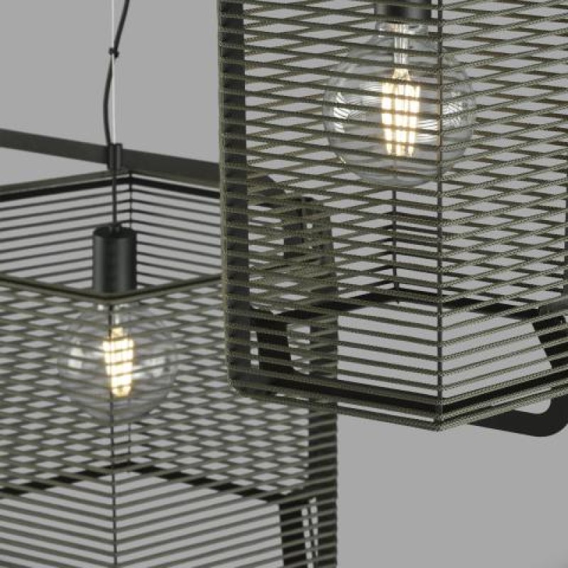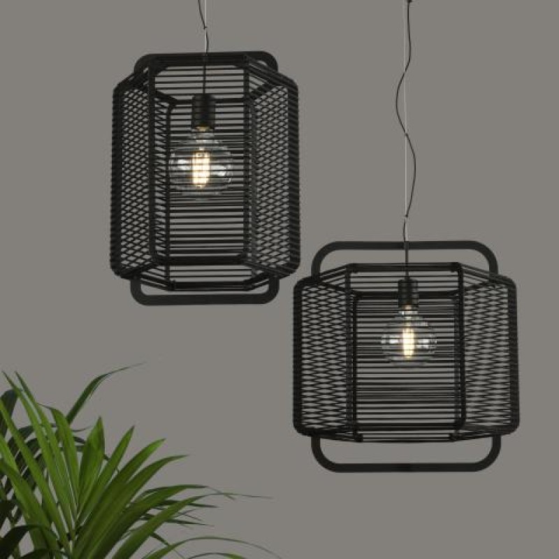 Este colgante atemporal tiene la estructura de metal en color negro que contiene unas tiras alargadas de polipropileno disponibles en tres colores: negro, arena y verde alga.
