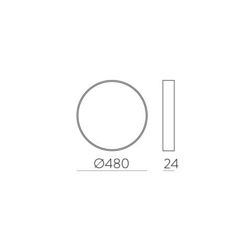 -48 cm de diámetro con una potencia de 36w, 4400 lúmenes y una temperatura de 3000-4000k. Sus medidas son Ø480x24mm.
