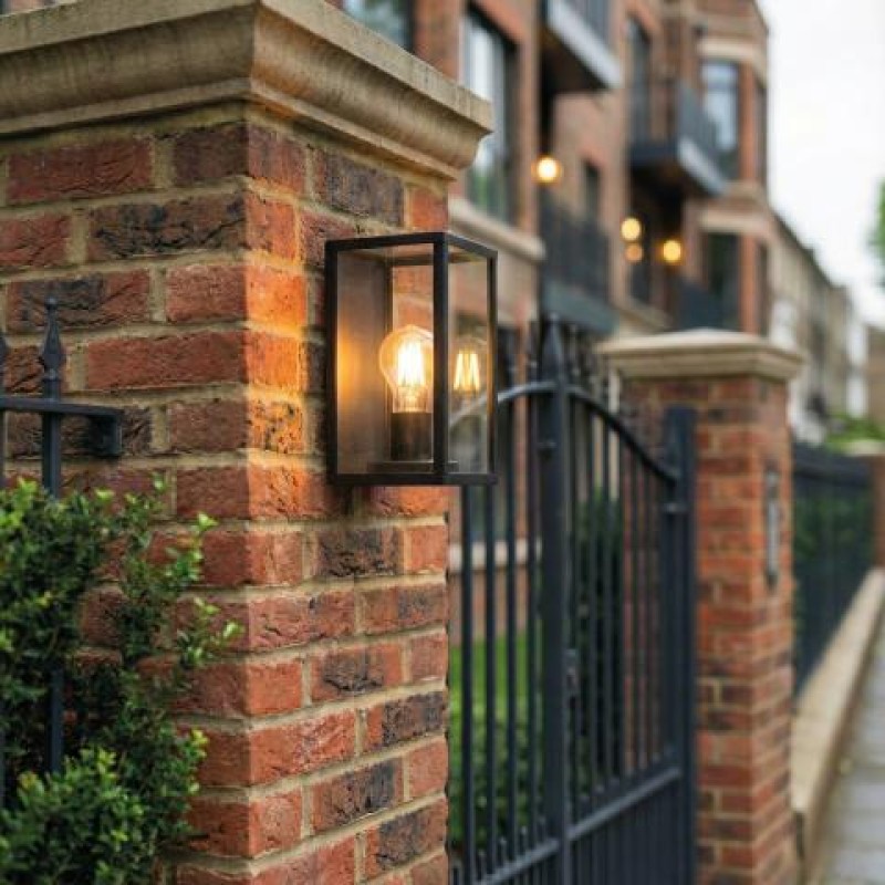 Aplique de pared para uso exterior confeccionado a partir de aluminio y cristal, lo que nos permite ver el interior del aparato, por lo que la bombilla seleccionada por el usuario cobra gran importancia.