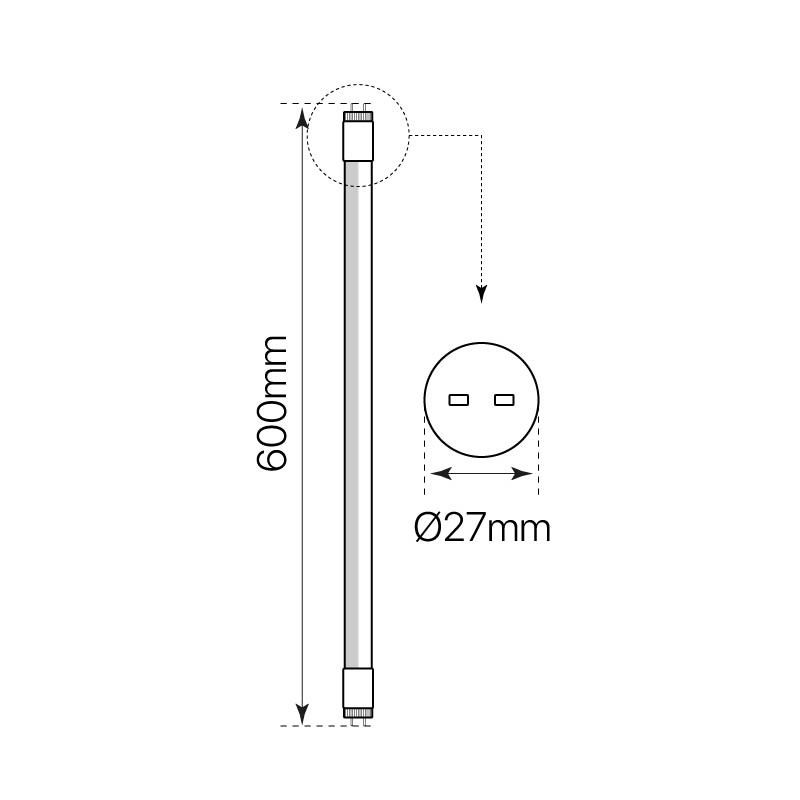 - Fuente de luz LED con una potencia de 9w 800 lm y una temperatura de 6400k. Sus medidas son Ø27x600mm.