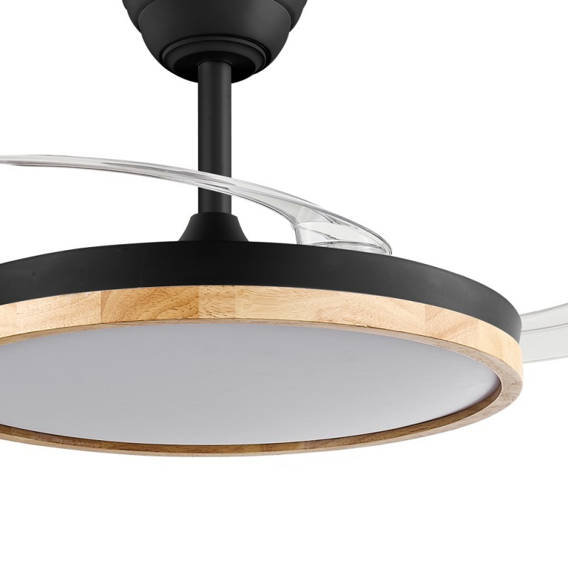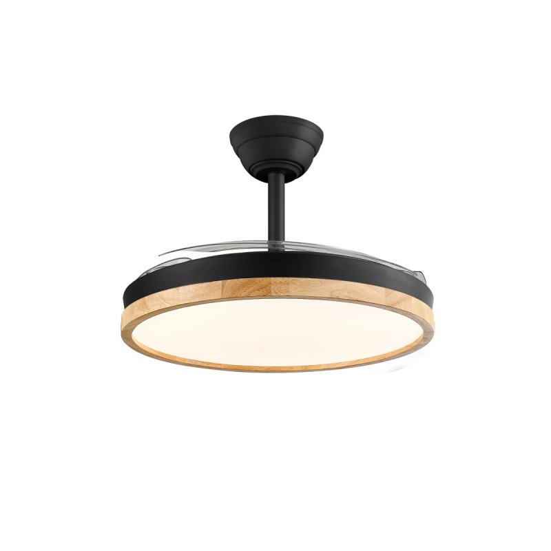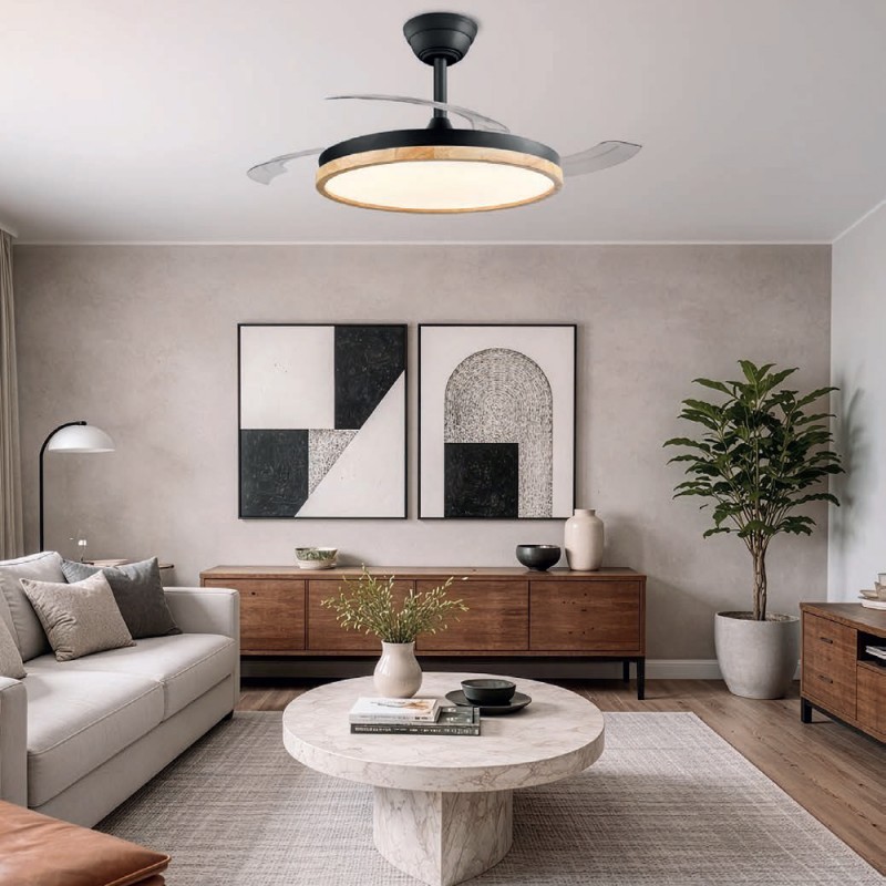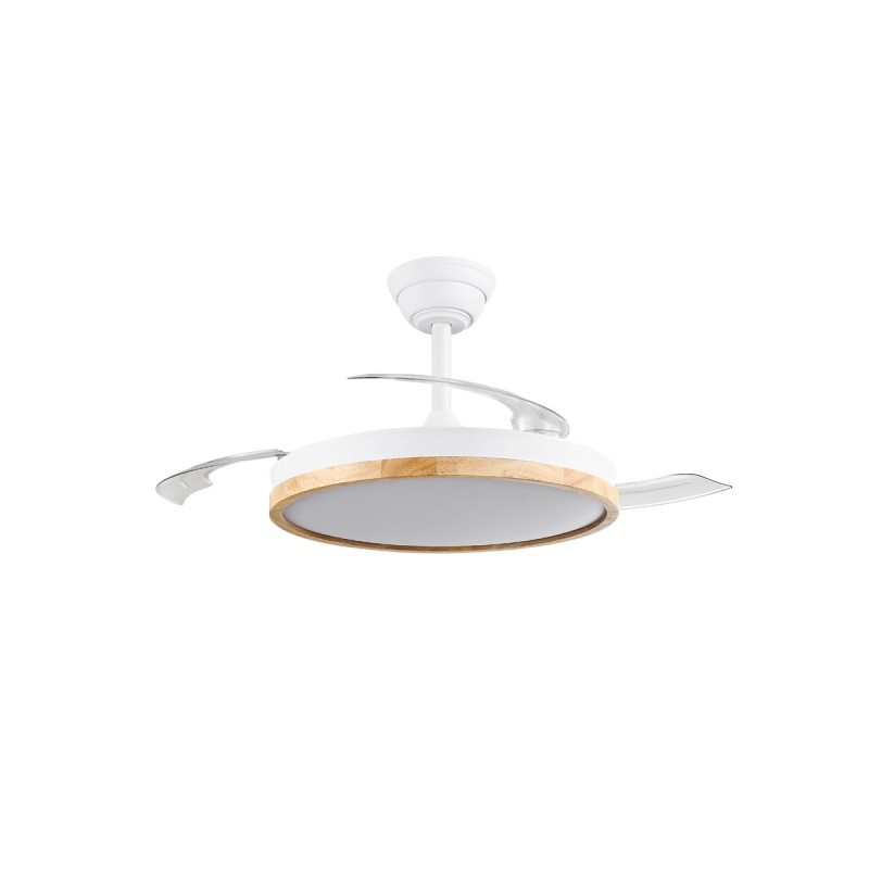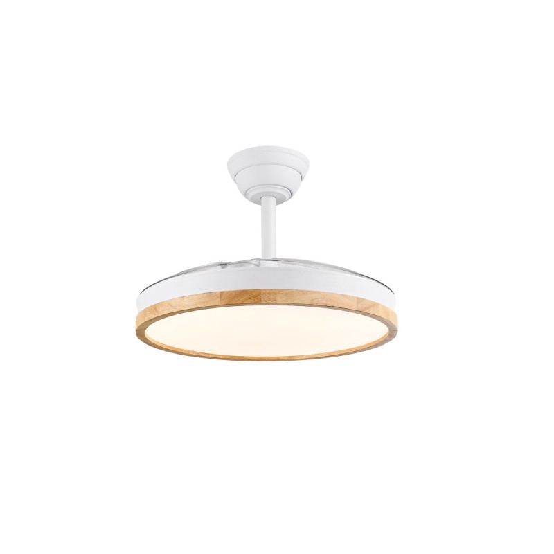 Fabricado en madera y metal, difusor PVC opal y las aspas ec PC.
